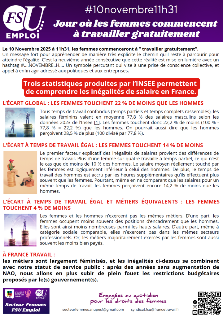 Actualité à France Travail #10novembre11h31 FSU Emploi HdF 7 novembre 2025 #10novembre11h31 – Jour où les femmes commencent à travailler gratuitement
