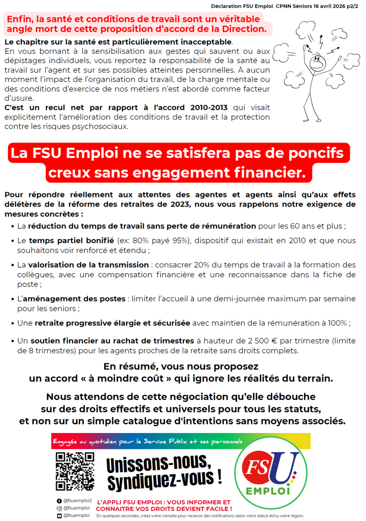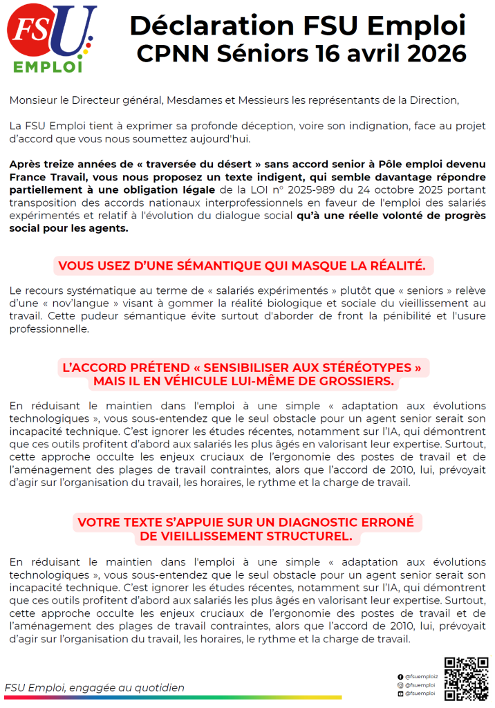 Accords France Travail accord senior FSU Emploi HdF 24 avril 2026 Déclaration FSU Emploi – Négociation accord séniors du 16 avril 2026