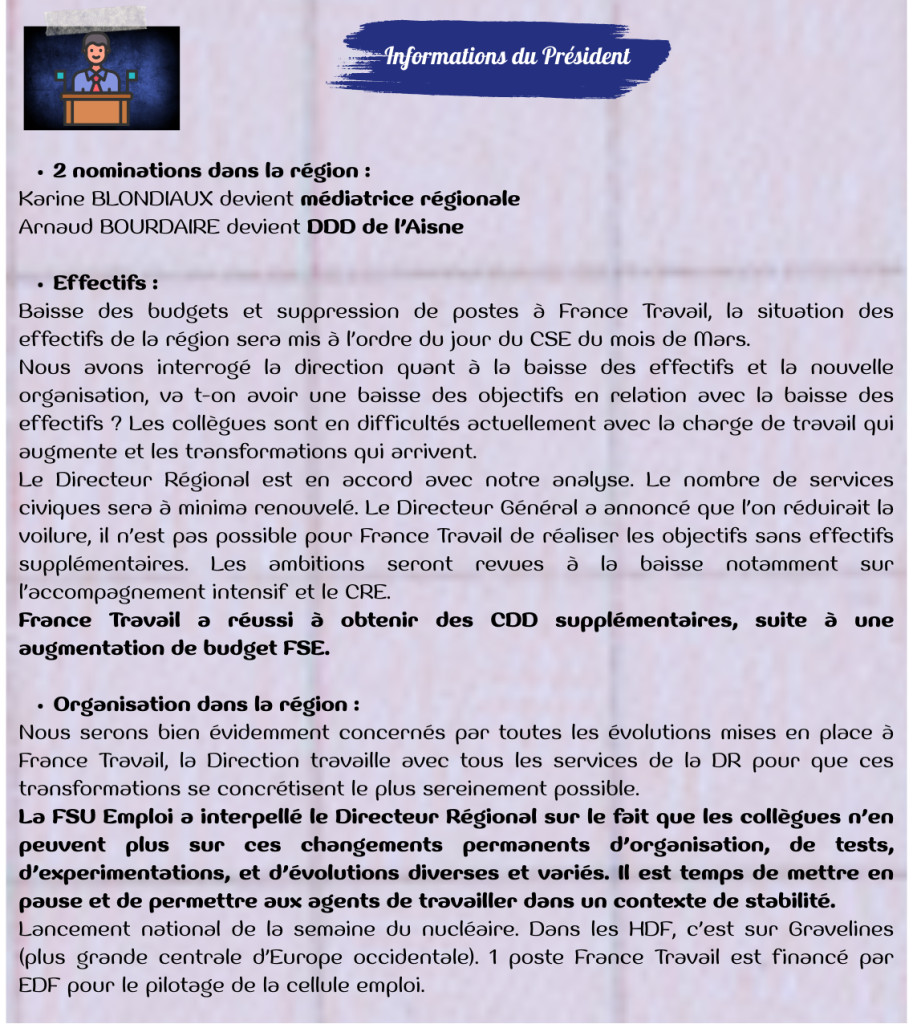 Information du président (effectifs et organisation) – Quoi de neuf au CSE du 26 février 2026 ?