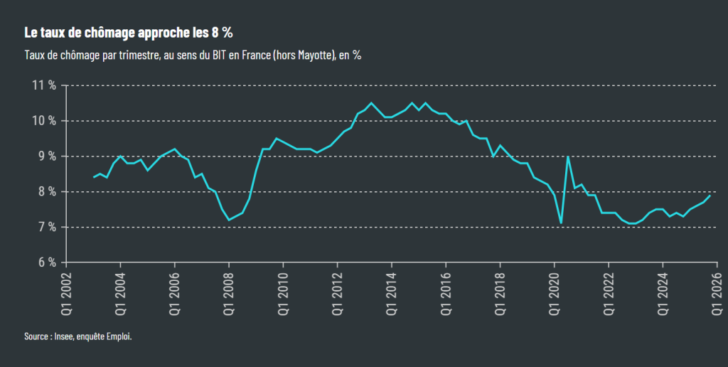 - le taux de chômage tutoie les 8 % en France, rendant inatteignable l’objectif de plein-emploi en 2027