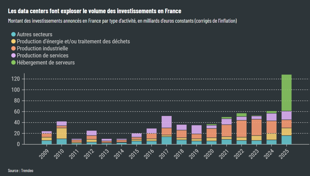 2025 a été un cru exceptionnel pour l’investissement en France : le montant total des projets annoncés tous secteurs confondus avoisine les 125 milliards d’euros, selon le cabinet Trendeo. Soit le double du niveau de 2022, qui constituait le précédent record. « Mais ce chiffre est trompeur », met tout de suite en garde l’éditeur de données économiques, qui précise que « les data centers représentent à eux seuls environ 67 milliards d’euros, soit plus de la moitié du total ».
