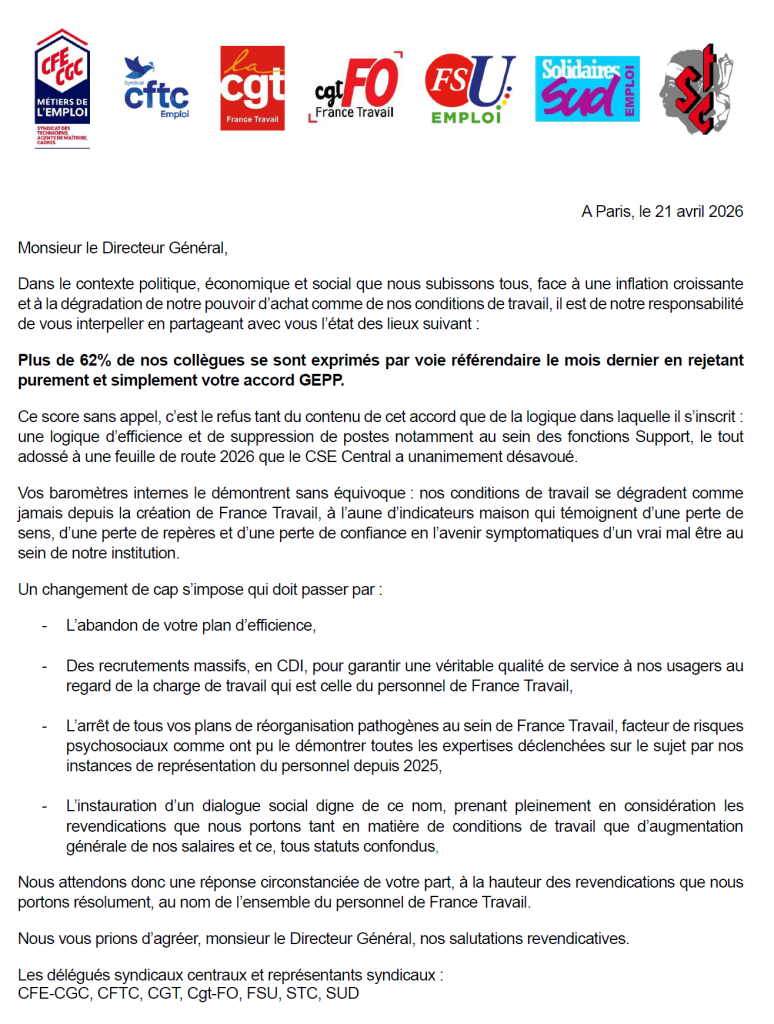 Actualité à France Travail GEPP FSU Emploi HdF 24 avril 2026 Lettre ouverte intersyndicale adressée au Directeur Général sur les suites du référendum GEPP