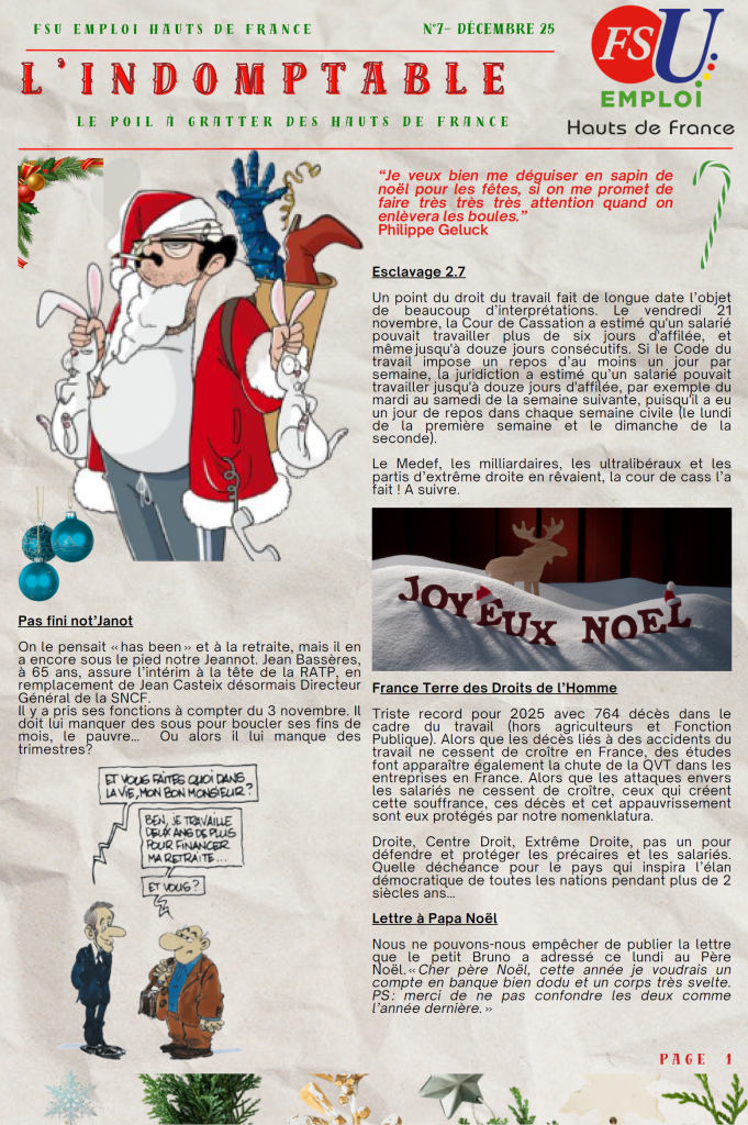 L'indomptable INDOMPTABLE FSU Emploi HdF 16 décembre 2025 L’Indomptable n°7 Pour retrouver le journal satirique de la FSU Emploi Hauts-de-France, cliquez sur l’image ci-dessous. Bonne lecture 🙂