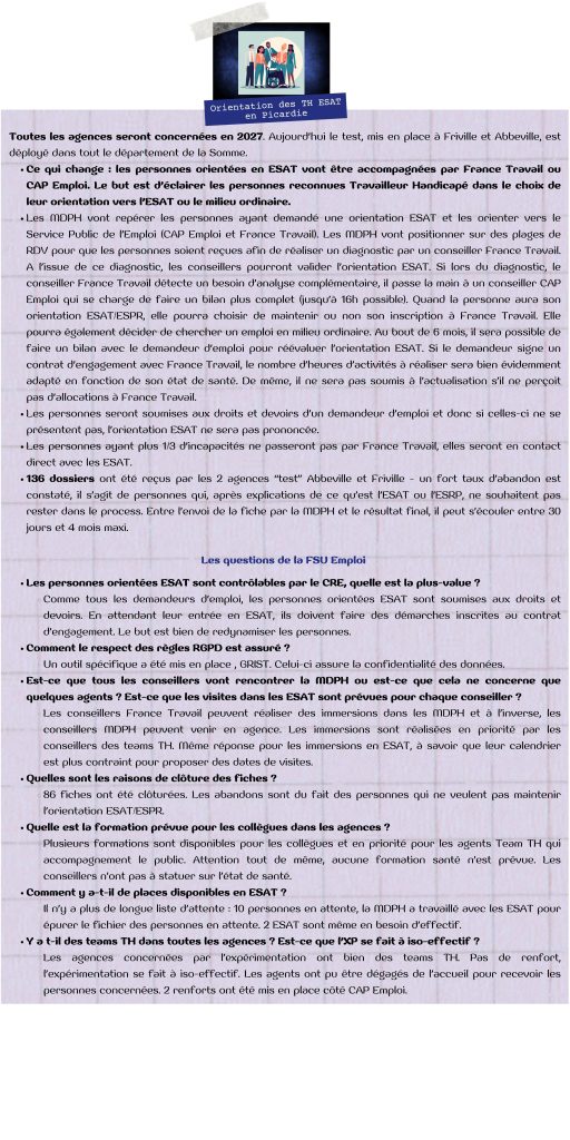 Quoi de neuf au CSE ? FSU Emploi HdF 24 octobre 2025 Orientation des TH ESAT en Picardie – Quoi de neuf au CSE du 23 octobre 2025
