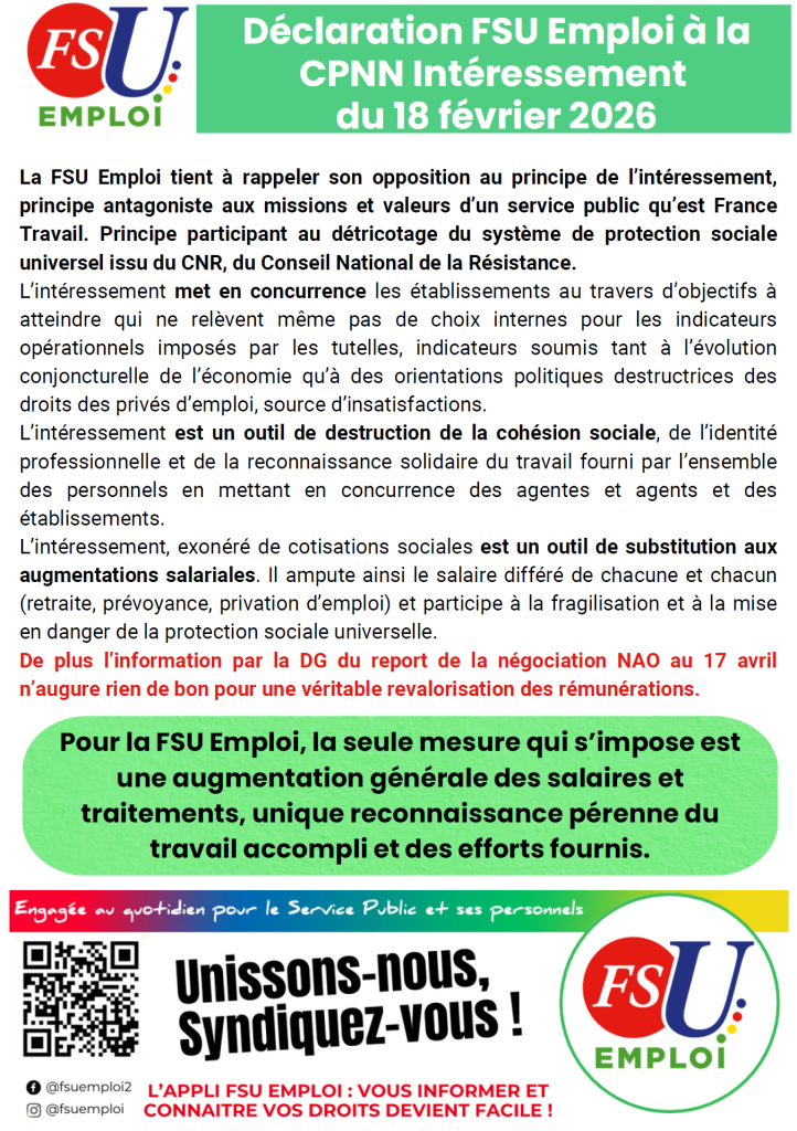 Accord intéressement PRIME INTERESSEMENT FSU Emploi HdF 19 février 2026 Prime d’intéressement – déclaration de la FSU Emploi du 18 Février 2026