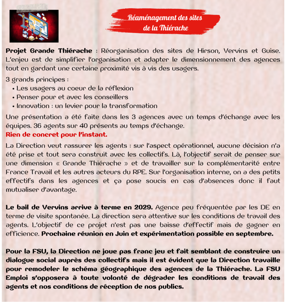 Quoi de neuf au CSE ? TRAVAUX THIERACHE FSU Emploi HdF 27 février 2026 Réaménagement des sites de la Thiérache – Quoi de neuf au CSE du 26 Février 2026