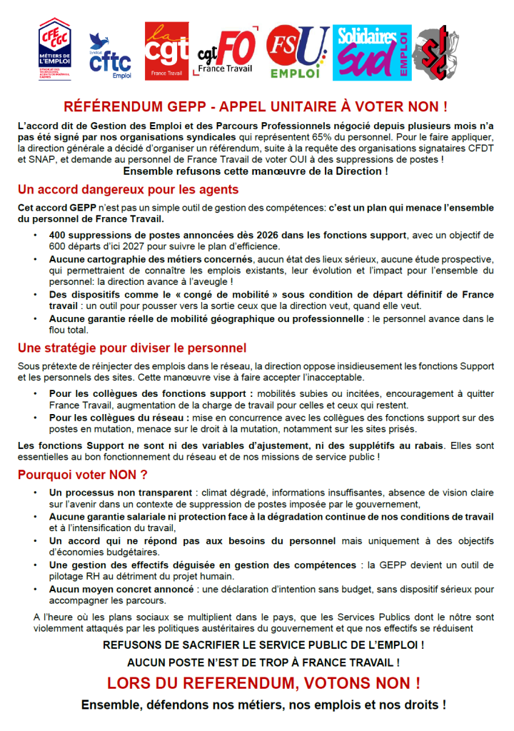 Actualité à France Travail GEPP, referendum FSU Emploi HdF 6 février 2026 Référendum GEPP – appel à voter NON Le vote devrait se tenir du 12 au 19 Mars par voie électronique.