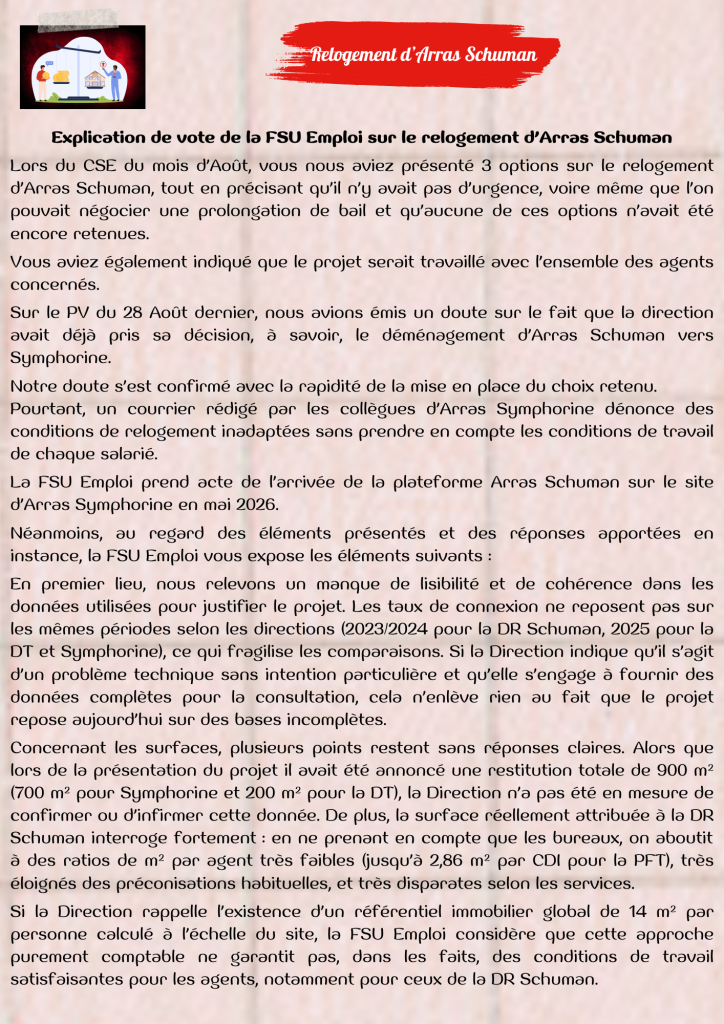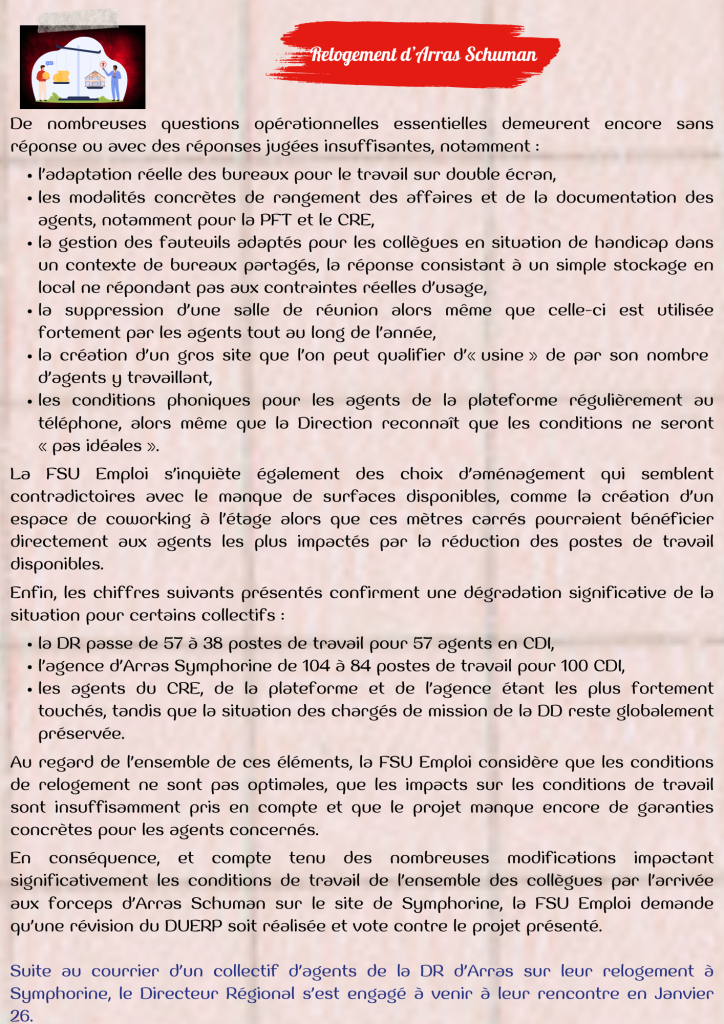 Quoi de neuf au CSE ? Relogement Arras FSU Emploi HdF 22 décembre 2025 Relogement d’Arras Schuman – Quoi de neuf au CSE du 18 décembre 2025