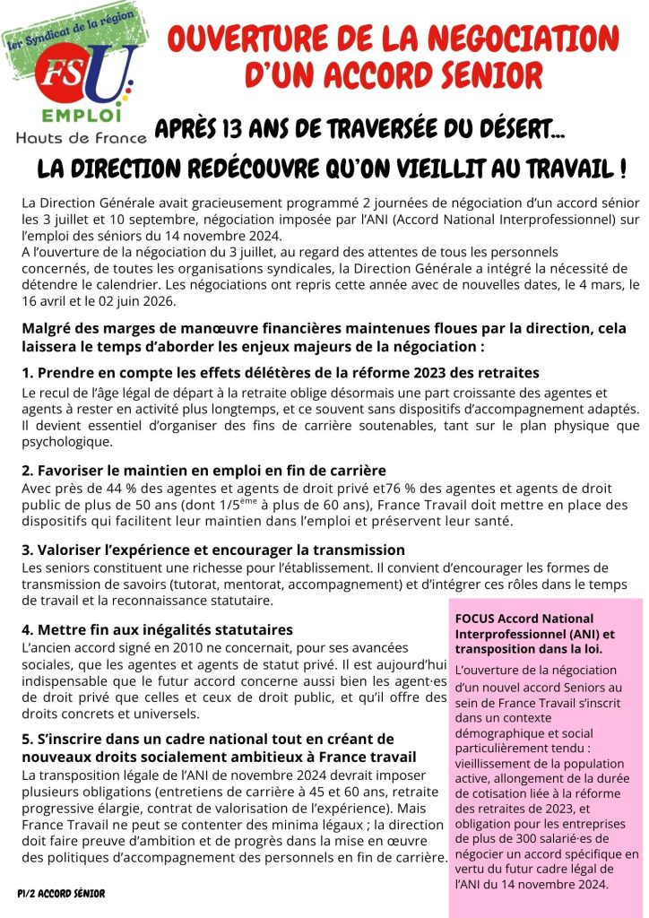 Actualité à France Travail accord senior FSU Emploi HdF 2 avril 2026 Reprise des négociations de l’accord sénior : les propositions de la FSU Emploi