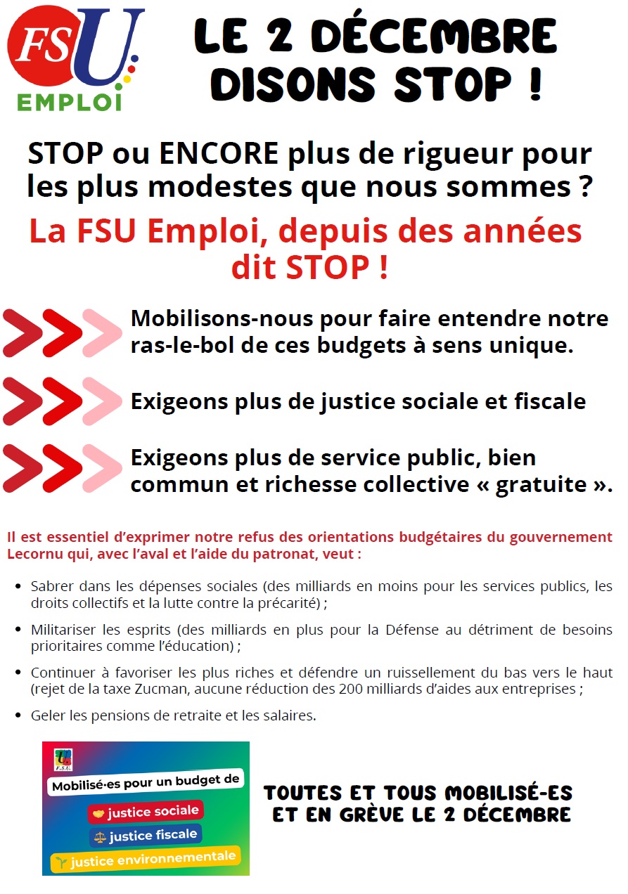 27 novembre 2025 Actualité à France Travail Le 2 Décembre, disons stop ! À FRANCE TRAVAIL :Nous subissons la mise en place de la loi dite plein Emploi,…