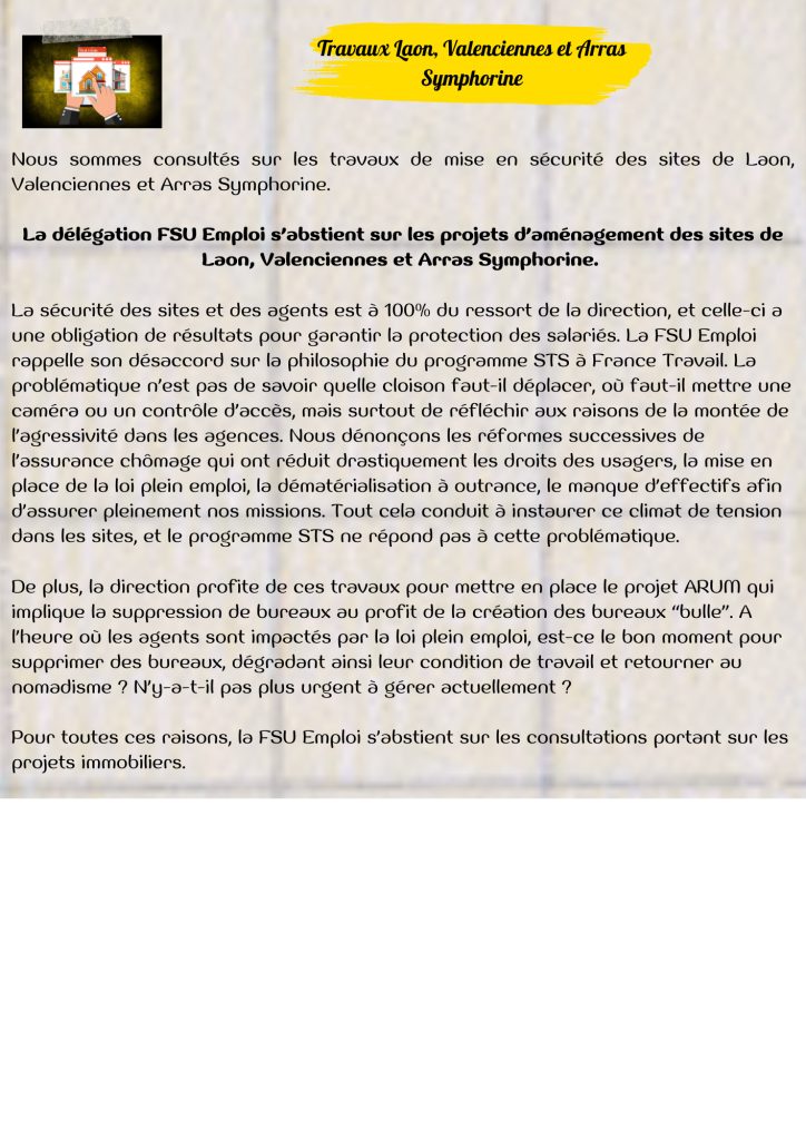 Quoi de neuf au CSE ? ARRAS, LAON, TRAVAUX FSU Emploi HdF 22 décembre 2025 Travaux Laon, Valenciennes et Arras Symphorine – Quoi de neuf au CSE du 18 décembre 2025